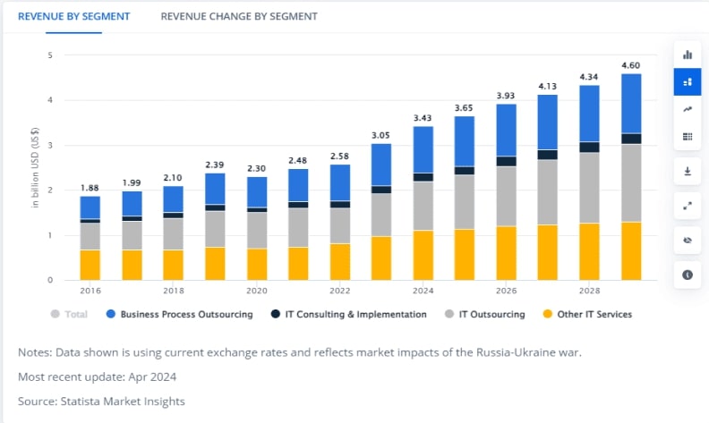 - According to Statista, the Ukrainian market of IT services is expected to hit $3.42 bln in 2024. The market is projected to grow annually by 6.11%, showing positive dynamics reaching $4.60 bln by 2029.